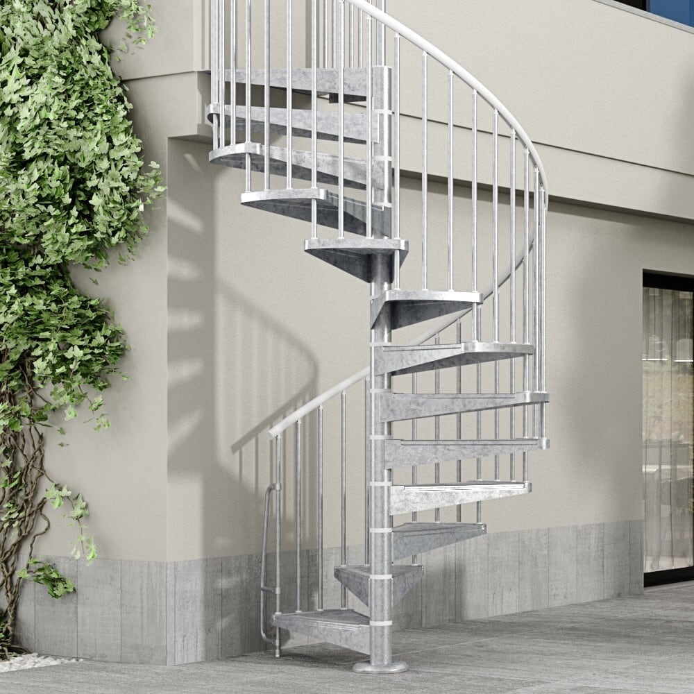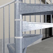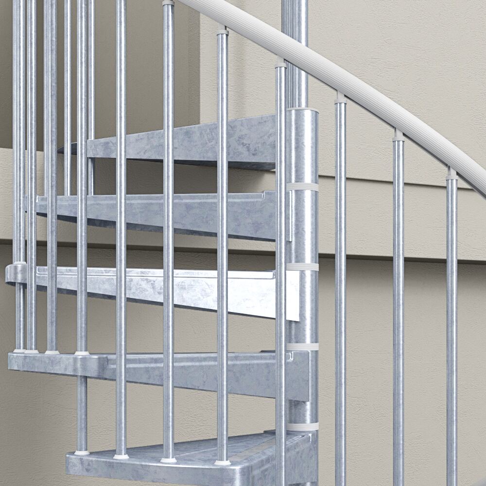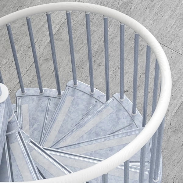 錆や酸化に強い亜鉛メッキスチールとPVC製手摺を組み合わせた屋外用螺旋階段です。